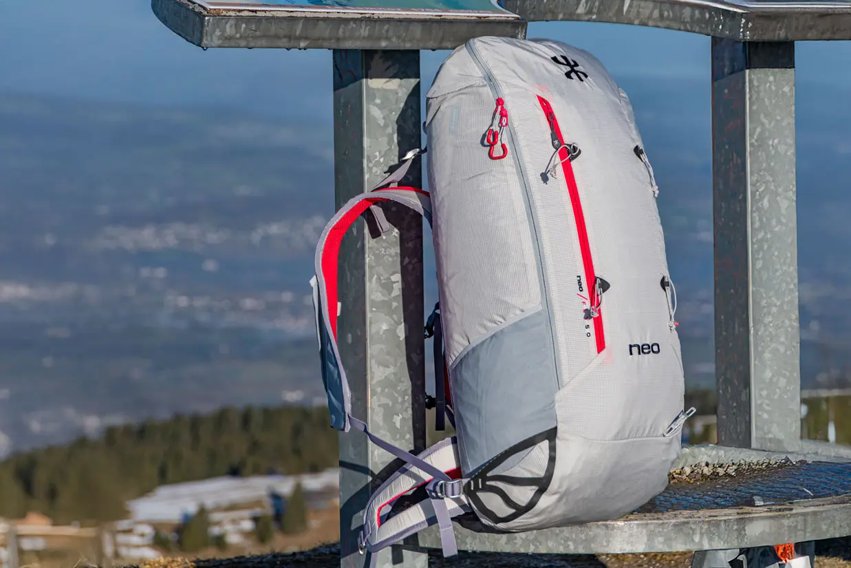 超轻背包,整个背包底部均采用 NEO 背负系统:肩带与背包的负载系统相连,而不是像传统那样背部与底部相连。符合人体工程学的背部和腰带设计适合长时间背负。30升背包提供带水壶口袋,越野跑步型肩带。